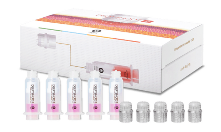 DEEP SHOOT AA is a multi-functional cocktail containing essential Anti-Aging agents combined with innovative pain-free 32G hypodermic multi-needle device, TurtlePin (19 pin, 0.5mm), for complete rejuvenation and effective Anti-Aging effects. Key active ingredients such as Glutathione, Peptides, Growth factors, PDRN and Vitamin B complex are replenished to maintain youthful skin condition and reduce the appearance of aging skin. With minimal pain, DEEP SHOOT AA’s absorption rate of the solution is 30 times higher than topical application and 15 times higher than MTS devices. With 0.5mm multi-needles, DEEP SHOOT AA is designed for use at professional beauty salons and spa.